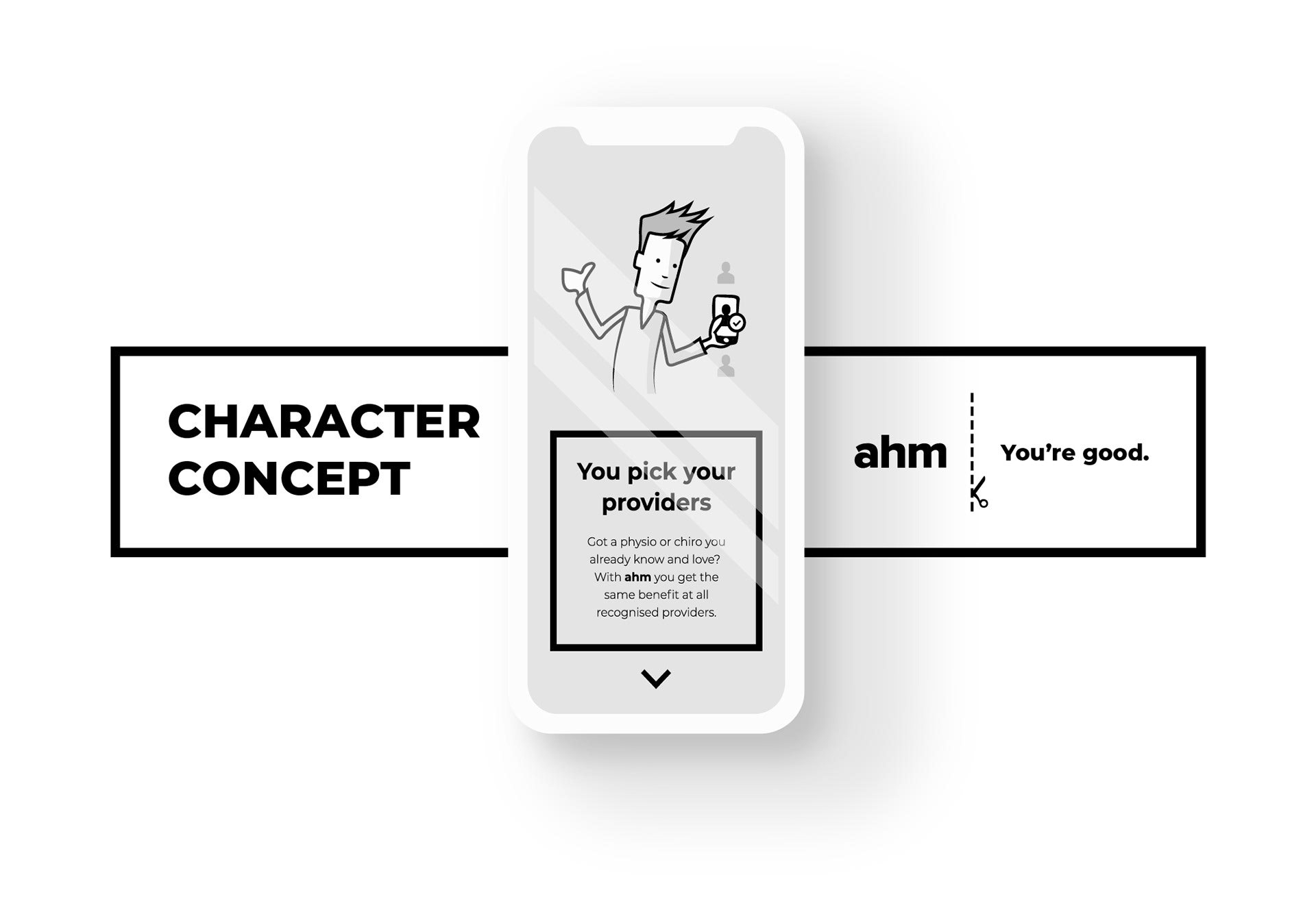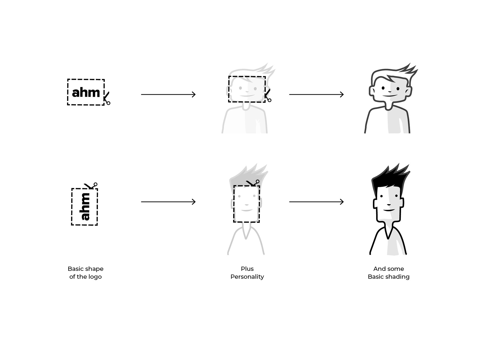 The Scissor Cut Logic: Inspiration came from an element within the existing brand. The defining feature of ahm’s identity is the "Scissor Cut" line; a sharp, rectangular graphic element. This rectangle was used as the foundational "primitive" for the character concepts. By basing the characters' anatomy on the specific proportions of the cut line, we created a subtle, subconscious link between the brand's graphic device and its new human face. The approach was Modular Minimalism: characters built from the same geometric building blocks as the UI, ensuring that every illustration felt like an extrusion of the logo itself.